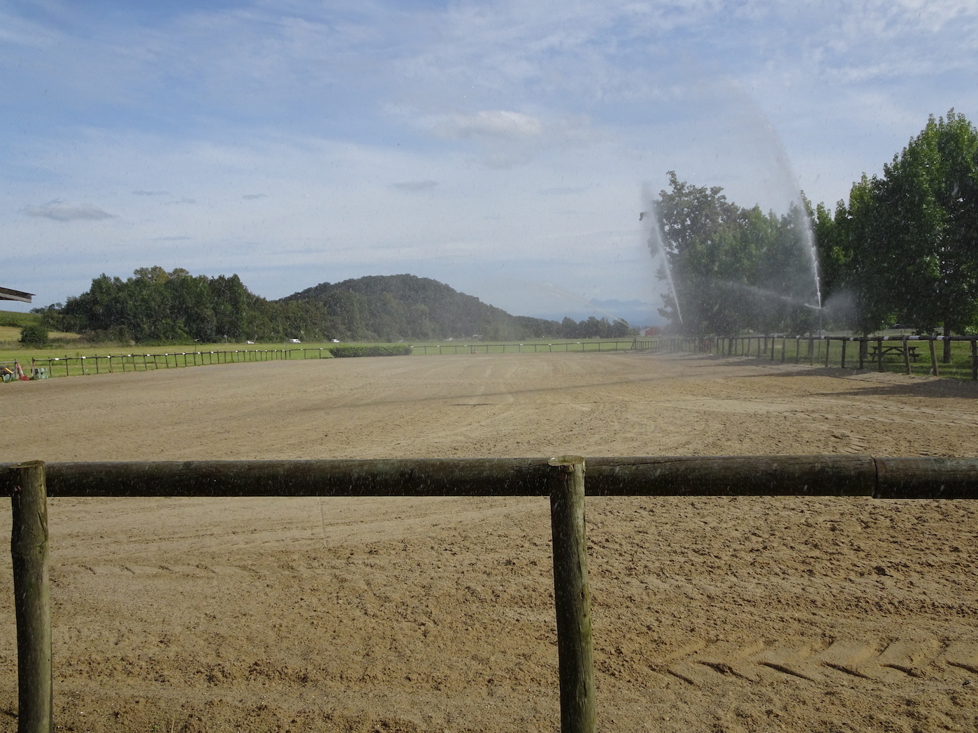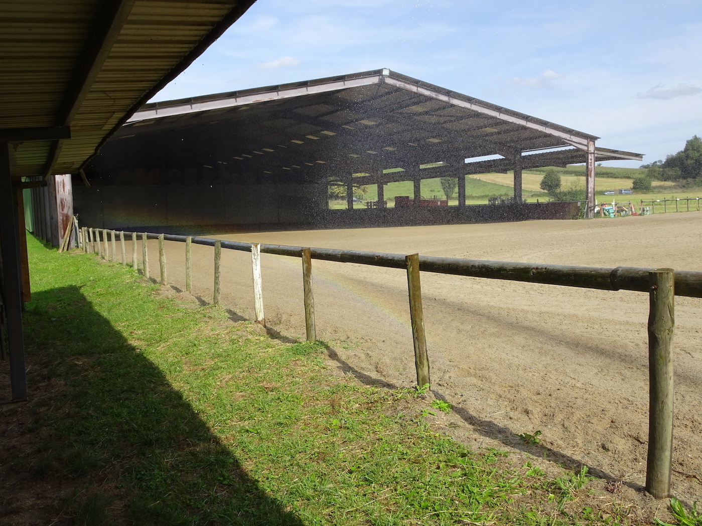 Détail Carrière en sable 80x35m, avec éclairage et arrosage automatique. Accès à une carrière couverte de 30x35m. Des obstacles sont mis à disposition ainsi que le matériel pédagogique.