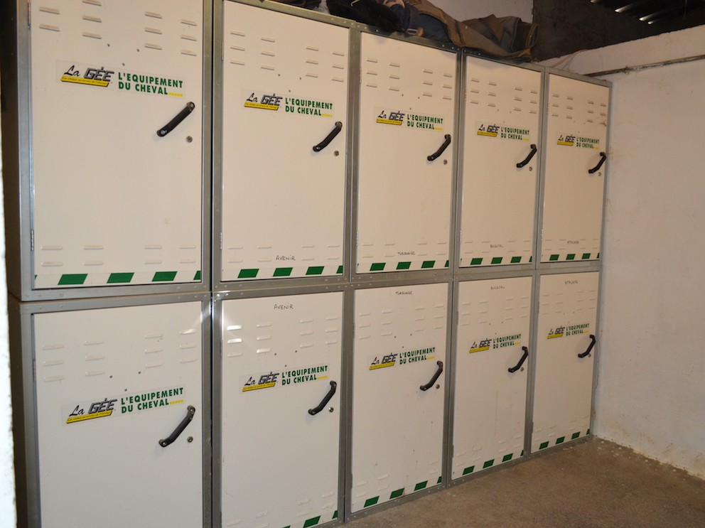 Un grand espace regroupant trois boxes de préparation avec des tapis en caoutchouc, une douche et des selleries avec casiers individuels permet de préparer et soigner les chevaux en toute sécurité.